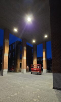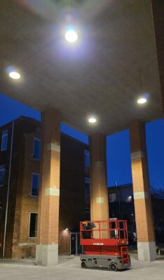 Montering af 4 stk. Københavnerlamper i port med ca. 10 meters loftshøjde.